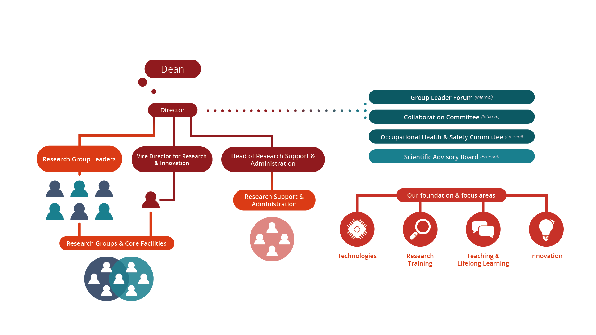 We ensure coherent and relevant support through direct dialogue with our researchers, covering both academic and operational support, including pre- and post-award support, researcher training, teaching and outreach activities. Our team also carries out leadership support and project management of major research and research-supportive programs.